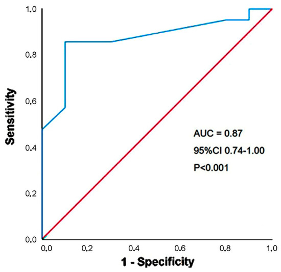 A third-trimester BMI > 27 kg/m2 had 86% sensitivity and 90% specificity (AUC = 0.87; 95% CI 0.74–1.00, p = 0.004) for predicting the secondary outcome (Figure 3).