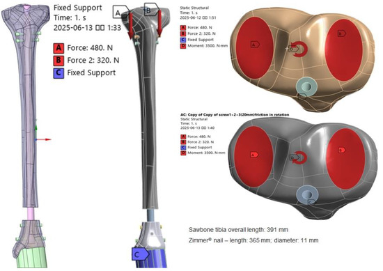 Three loading conditions were simulated to evaluate the mechanical behavior of the fixation constructs under conditions intended to approximate physiological loading as possible. Specifically, three distinct loading modes were considered: static axial loading, internal rotation, and external rotation about the medial condyle axis. For the static loading condition, an axial load of 800 N was applied along the longitudinal axis of the tibia, distributed as 480 N medially and 320 N laterally to approximate an in vivo 55/45 medial–lateral load split (Figure 2) [11]. A torsional moment of 3500 N·mm was applied about the medial condyle axis to replicate in vivo tibial torsion during high-flexion activities [12]. All implant components were modeled as linear elastic, homogeneous, and isotropic materials. Given that the applied loads (800 N axial, 3500 N·mm torsional) are well below the yield strength of Ti-6Al-4V alloy (≈880 MPa), the linear elastic assumption is valid and enables pure comparison of geometric and boundary condition effects on stress distribution. These torsional loads were simulated around the medial condyle of the proximal tibia, which served as the rotational axis. Binding contact was defined between the internal fixation screws and the tibia in accordance with previously validated finite element testing protocols [13]. Finite element analysis was performed using commercially available Ansys® software, and the outcomes were assessed in terms of von Mises stress (VMS), measured in megapascals, and relative displacement of the implant with respect to the bone, which served as an indicator of fixation stability.