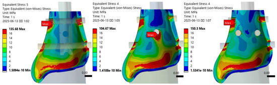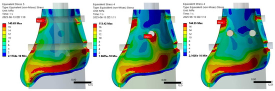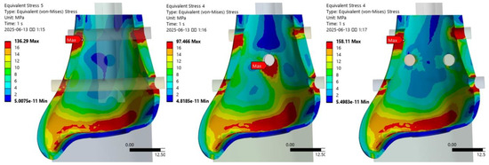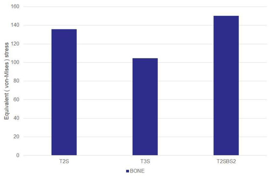 The maximum VMS in the distal tibia varied by fixation method (Figure 3). The VMS was lowest in the T3S model with three interlocking screws, indicating a more favorable distribution. In contrast, the T2SBS2 model with additional blocking screws showed the highest stress, suggesting that blocking screws may increase local contact stress.