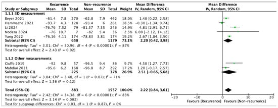 In a subgroup analysis limited to studies utilizing three-dimensional (3D) imaging for LA-EAT quantification, the attenuation values also differed significantly between the recurrence and non-recurrence groups, amounting to −73.59 ± 13.55 HU and −76.44 ± 13.81 HU, respectively (MD = 2.20; 95% CI: 0.42 to 3.98; p = 0.02).