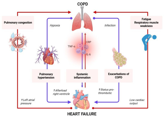 Pathophysiological mechanisms in HF–COPD. COPD, chronic obstructive pulmonary disease; CRP, C-reactive protein; TNF-α, tumor necrosis factor-α; IL-6, interleukin-6; ↑, high, elevated. Created with BioRender.com; accessed on 31 May 2025.