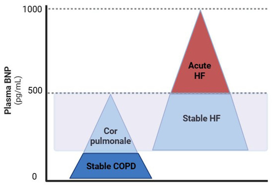 Overlap in the BNP levels in patients with HF and COPD. COPD, chronic obstructive pulmonary disease; HF, heart failure. Created with BioRender.com; accessed on 11 June 2025.