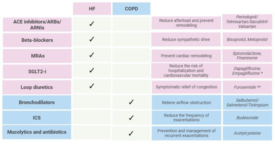 Guideline-directed treatment in HF and COPD. HF, heart failure; COPD, chronic obstructive pulmonary disease; ACE, angiotensin-converting enzyme; ARBs, angiotensin II receptor blockers; ARNIs, angiotensin receptor-neprilysin inhibitors; MRAs, mineralocorticoid receptor antagonists; SGLT2-i, sodium–glucose co-transporter 2; ICS, inhaled corticosteroids. Created with BioRender.com; accessed on 9 June 2025. * Recent studies suggest that SGLT2-i may have protective effects in COPD [81,82,83]. ** Administration of nebulized furosemide may contribute to the improvement and normalization of vital signs and respiratory function in individuals with COPD [84].