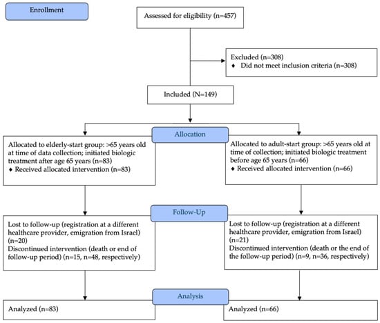 The Figure 1 illustrates the study enrollment process, including the total number of patients assessed for eligibility, exclusion, and the final number of participants included in the analysis. The flow diagram also highlights the allocation of participants into study groups and their progression through the study, including follow-up and analysis stages. Note: The elderly-start group was further divided into three subgroups based on the age at which biologic treatment was initiated: 65–70 years (n = 50), 70–75 years (n = 17), and >75 years (n = 16).