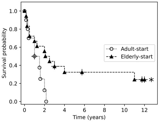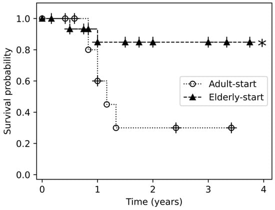 Drug survival of adalimumab as first treatment in the elderly-start and adult-start groups. The asterisk symbol (*) denotes the group in which a statistically significant survival benefit was observed.