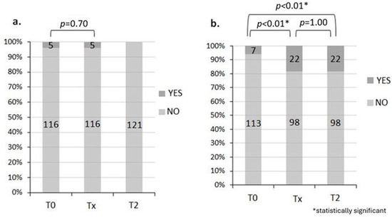 One month after the end of RT, all were without rectal bleeding and abdominal pain was absent in 81.6% of patients. Regarding rectal bleeding, there was a marked improvement in symptoms at T2 vs. T0 (statistical testing not possible due to 0 events in T2) (Figure 1a). However, regarding abdominal pain, there was a worsening at Tx compared with T0 (p < 0.01), while there was no difference between Tx and T2 (p = 1.00) (Figure 1b).