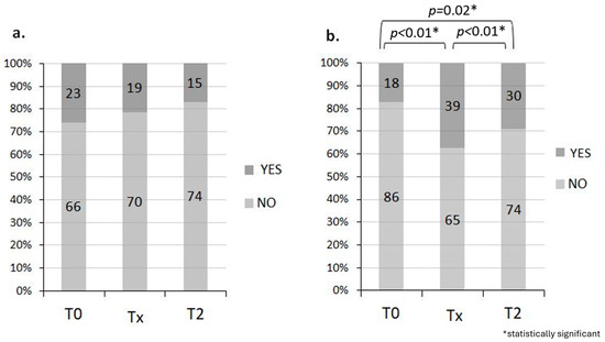 Ultimately for those with incontinence problems, there are no statistically significant changes over time (McNemar’s test, p = 0.26). However, 14.6% of patients have an improvement at T2 compared with T0. Regarding health perception, there is a worsening at T2 compared to T0 (p = 0.02) as well as at Tx compared to T0 (p < 0.01), while there is an improvement at T2 compared to Tx (p < 0.01) (Figure 2a,b).