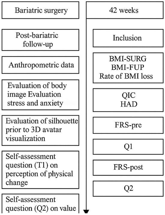 BMI-FUP: outpatient follow-up body mass index; BMI-surg: body mass index before bariatric surgery; pBMI: percentage of BMI loss; Tx-BMI: percentage of BMI loss per week; QIC: body image questionnaire; HAD: Hospital Anxiety and Depression Scale; FRS-pre: Stunkard figure rating scale before 3D avatar visualization; FRS-post: Stunkard figure rating scale after 3D avatar visualization.
