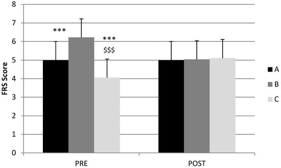 Stunkard scale scores recorded before (FRS-pre) and after (FRS-post) 3D avatar visualization for patient groups A, B, and C (Mean ± SE). ***: significantly different from group B (p < 0.001); $$$: significantly different from group A (p < 0.001). Group A: FRS-pre = FRS-post. Group B: FRS-pre > FRS-post. Group C: FRS-pre < FRS-post.
