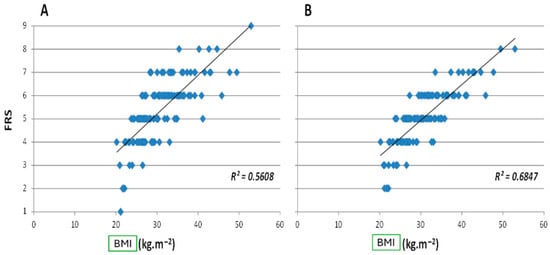 Linear regressions established for all subjects between the FRS score (i.e., “perceived body”) and BMI-FUP (i.e., “actual body”) before 3D avatar visualization ((A); FRS-pre) and after 3D avatar visualization ((B); FRS-post).
