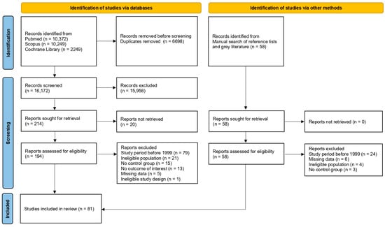 A total of 22,870 records were identified by the initial systematic search (10,372 via PubMed, 10,249 via Scopus and 2249 via Cochrane Library). After removing duplicate records, 16,172 were screened by title and abstract, and 214 were deemed suitable for full-paper appraisal; 194 full-text reports were retrieved, while the remaining 20 could not be obtained, even after a request was sent to the corresponding authors. Following the assessment of eligibility, 134 reports were excluded due to the following reasons: study period before 1999 (n = 79), ineligible population (n = 21), no control group (n = 15), no outcome of interest (n = 13), missing data (n = 5) and ineligible study design (n = 1). A manual search of reference lists of relevant publications and a search of grey literature identified 58 records suitable for full-paper appraisal. Full-text reports were retrieved for all of them. After the assessment of eligibility, 37 reports were excluded for the following reasons: study period before 1999 (n = 24), missing data (n = 6), ineligible population (n = 4) and no control group (n = 3). In total, 81 studies were included in the present meta-analysis [25,26,27,28,29,30,31,32,33,34,35,36,37,38,39,40,41,42,43,44,45,46,47,48,49,50,51,52,53,54,55,56,57,58,59,60,61,62,63,64,65,66,67,68,69,70,71,72,73,74,75,76,77,78,79,80,81,82,83,84,85,86,87,88,89,90,91,92,93,94,95,96,97,98,99,100,101,102,103,104,105]. A flow diagram illustrates the complete review process (Figure 1).