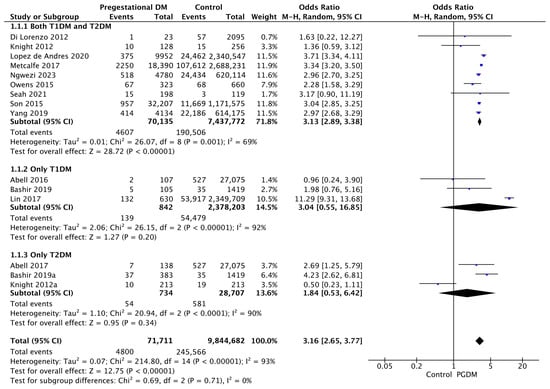 Fifteen studies reported data on gestational hypertension, including 71,711 pregnant women with PGDM and 9,844,682 pregnant women without PGDM or GDM. In pregnancies with PGDM, the risk of gestational hypertension was increased compared to control pregnancies (OR 3.16, 95% CI 2.65–3.77, p < 0.00001, I2 = 93%). The subgroup analysis, including studies reporting data only for one type of PGDM, did not show a statistically significant difference in the risk of gestational hypertension between T1DM and T2DM (p = 0.64) (Figure 3).