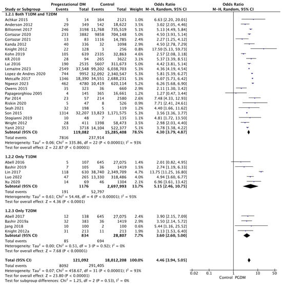 Thirty-two studies reported data on preeclampsia, including 121,092 pregnant women with PGDM and 18,012,208 pregnant women without PGDM or GDM. In pregnancies with PGDM, the risk of preeclampsia was increased compared to control pregnancies (OR 4.46, 95% CI 3.94–5.05, p < 0.00001, I2 = 93%). The subgroup analysis, including studies reporting data only for one type of PGDM, did not show a statistically significant difference in the risk of preeclampsia between T1DM and T2DM (p = 0.39) (Figure 4).