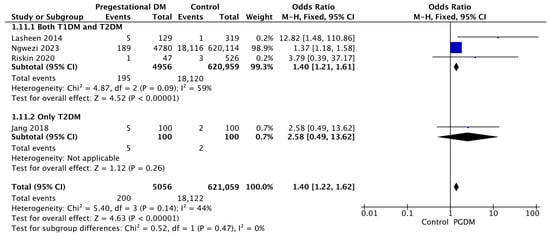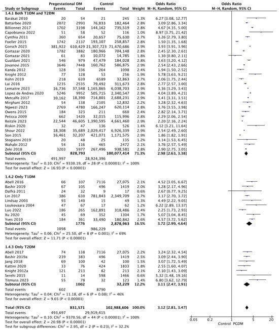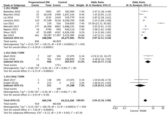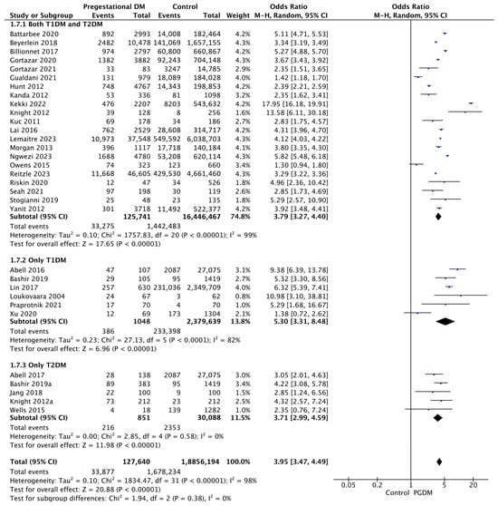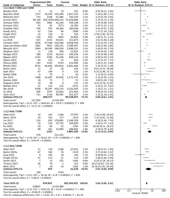 Forty-five studies reported data on cesarean delivery, including 831,571 pregnant women with PGDM and 102,988,606 pregnant women without PGDM or GDM. In pregnancies with PGDM, the risk of cesarean delivery was increased compared to control pregnancies (OR 3.12, 95% CI 2.81–3.47, p < 0.00001, I2 = 100%). The subgroup analysis, including studies reporting data only for one type of PGDM, did not show a statistically significant difference in the risk of cesarean delivery between T1DM and T2DM (p = 0.27) (Figure 6).