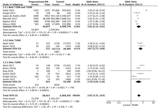 Fourteen studies reported data on the induction of labor, including 38,013 pregnant women with PGDM and 6,369,376 pregnant women without PGDM or GDM. In pregnancies with PGDM, the risk of labor induction was increased compared to control pregnancies (OR 2.92, 95% CI 2.35–3.63, p < 0.00001, I2 = 98%). The subgroup analysis, including studies reporting data only for one type of PGDM, did not show a statistically significant difference in the risk of induction of labor between T1DM and T2DM (p = 0.28) (Figure 7).