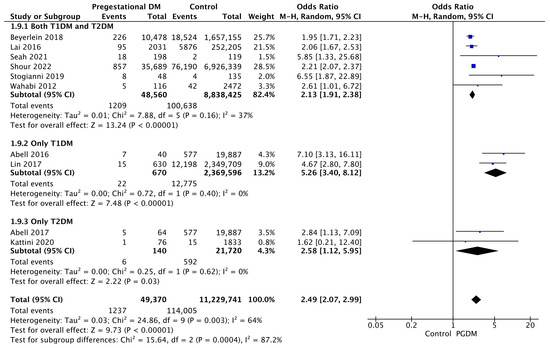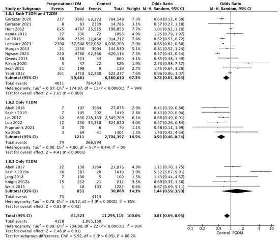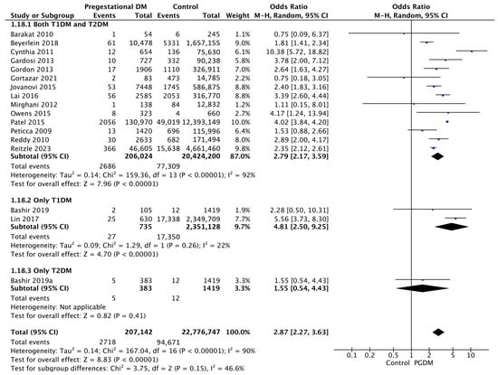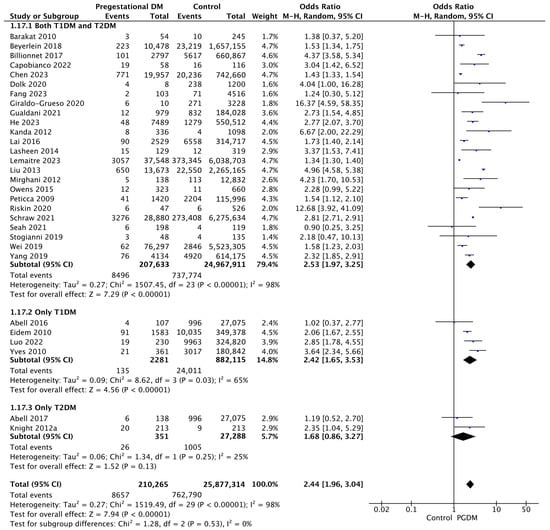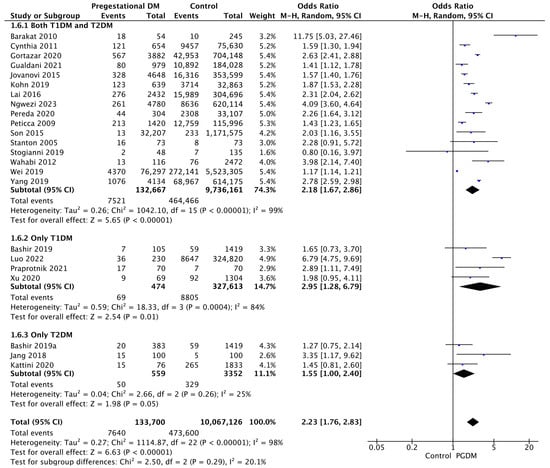 Twenty-three studies reported data on macrosomia, including 133,700 pregnant women with PGDM and 10,067,126 pregnant women without PGDM or GDM. In pregnancies with PGDM, the risk of macrosomia was increased compared to control pregnancies (OR 2.23, 95% CI 1.76–2.83, p < 0.00001, I2 = 98%). The subgroup analysis, including studies reporting data only for one type of PGDM, did not show a statistically significant difference in the risk of macrosomia between T1DM and T2DM (p = 0.18) (Figure 8).