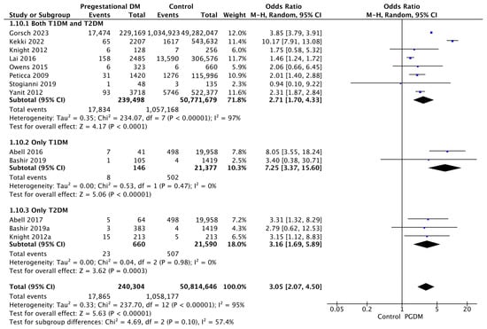 Thirteen studies reported data on shoulder dystocia, including 240,304 pregnant women with PGDM and 50,814,646 pregnant women without PGDM or GDM. In pregnancies with PGDM, the risk of shoulder dystocia was increased compared to control pregnancies (OR 3.05, 95% CI 2.07–4.50, p < 0.00001, I2 = 95%). The subgroup analysis, including studies reporting data only for one type of PGDM, did not show a statistically significant difference in the risk of shoulder dystocia between T1DM and T2DM (p = 0.10) (Figure 12).