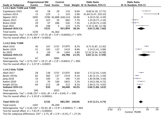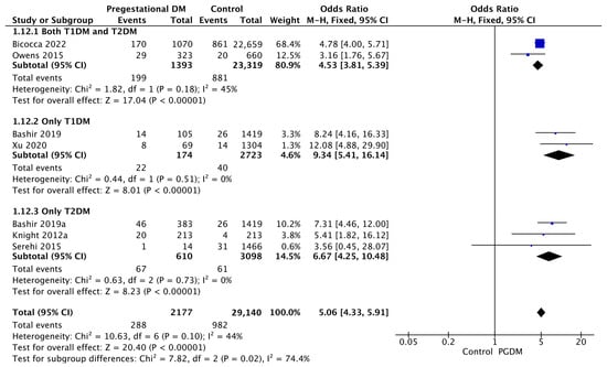 Seven studies reported data on polyhydramnios, including 2177 pregnant women with PGDM and 29,140 pregnant women without PGDM or GDM. In pregnancies with PGDM, the risk of polyhydramnios was increased compared to control pregnancies (OR 5.06, 95% CI 4.33–5.91, p < 0.00001, I2 = 44%). The subgroup analysis, including studies reporting data only for one type of PGDM, did not show a statistically significant difference in the risk of polyhydramnios between T1DM and T2DM (p = 0.35) (Figure 14).
