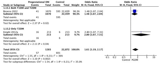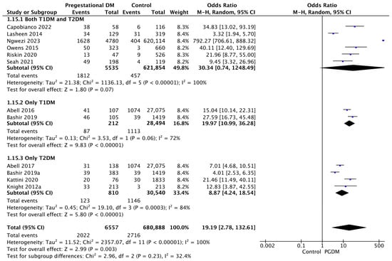 Two studies reported data on oligohydramnios, including 1283 pregnant women with PGDM and 22,872 pregnant women without PGDM or GDM. In pregnancies with PGDM, the risk of oligohydramnios was increased compared to control pregnancies (OR 1.61, 95% CI 1.19–2.17, p = 0.002, I2 = 36%). No studies reported data only for T1DM to allow a subgroup analysis between T1DM and T2DM (Figure 15).