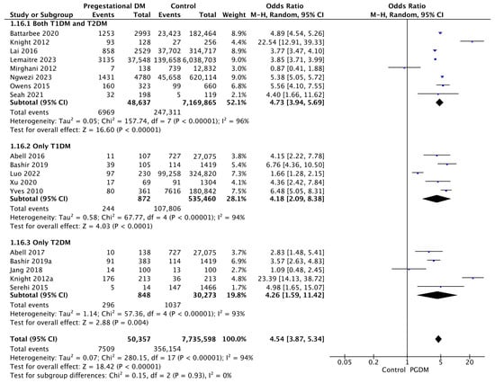 Fourteen studies reported data on neonatal hyperbilirubinemia, including 6726 pregnant women with PGDM and 682,292 pregnant women without PGDM or GDM. In pregnancies with PGDM, the risk of neonatal hyperbilirubinemia was increased compared to control pregnancies (OR 3.45, 95% CI 2.51–4.74, p < 0.00001, I2 = 86%). The subgroup analysis, including studies reporting data only for one type of PGDM, did not show a statistically significant difference in the risk of neonatal hyperbilirubinemia between T1DM and T2DM (p = 0.13) (Figure 16).