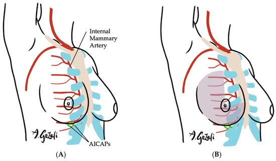 - Carrasco-López, C.; Ibañez, J.F.J.; Vilà, J.; Tomás, M.A.L.; López, J.N.; Miguel, I.P.; Fernandez-Llamazares-Rodriguez, J.; Higueras-Suñe, C. Anterior intercostal artery perforator flap in immediate breast reconstruction: Anatomical study and clinical application. Microsurgery 2017, 37, 603–610. [Google Scholar] [CrossRef] [PubMed]