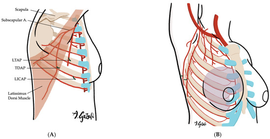 - Mangialardi, M.L.; Baldelli, I.; Salgarello, M.; Raposio, E. Breast Reconstruction Using the Lateral Thoracic, Thoracodorsal, and Intercostal Arteries Perforator Flaps. Plast. Reconstr. Surg. Glob. Open 2021, 9, e3334. [Google Scholar] [CrossRef]