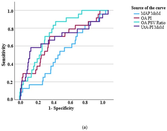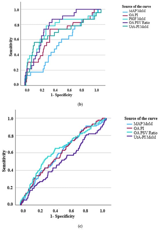 In the cases of the late PE group versus the no PE group, there was discriminatory capacity based on the OA PSV ratio, MAP MoM, and PlGF MoM (Table 2).