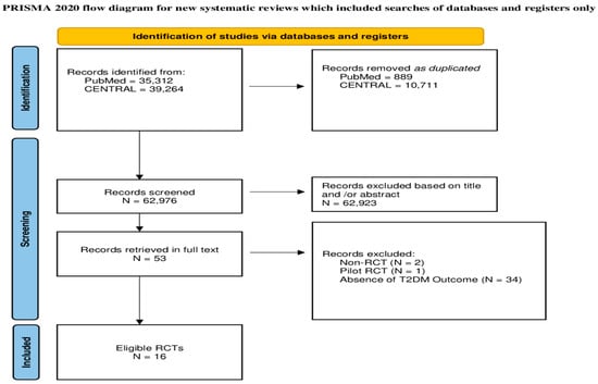 The initial search yielded 74,576 items. After removing 11,600 duplicates, 62,976 items remained to be assessed for potential eligibility. A total of 62,923 papers were excluded based on their title and/or abstract. Then, we retrieved the full text of the remaining 53 papers. Two studies had non-RCT designs, one was a pilot RCT, and 34 did not report the outcome of T2DM and were excluded. Finally, 16 RCTs were accepted (Figure 1).