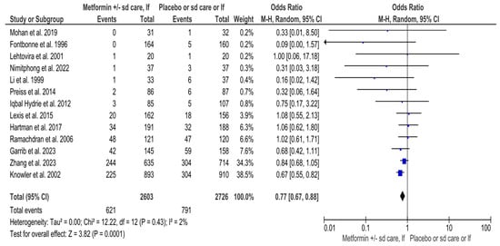 A total of 5329 high-risk individuals (2603 in the intervention and 2726 in the control arm) were analyzed for T2DM in 13 RCTs that evaluated overall effect of metformin in preventing diabetes [31,32,33,34,35,37,38,39,42,43,44,45,46] (Supplemental Table S2) (Figure 2). Among them, 1412 (26.5%) [(621 (23.9%) in the intervention, and 791 (29%) in the control group)] developed T2DM (Supplemental Table S2) (Figure 2). Although the Q statistic was non-significant for heterogeneity (Q 12.22, p-value 0.43), the upper limit of the I2 index for variability measurements was more than 50% (I2 2%, 95% CI 0, 57%) (Figure 2). Thus, the RE model was used for synthesis (Figure 2). The MA revealed statistically significant results for the overall effect of metformin in preventing T2DM among high-risk adults (OR 0.77, 95% CI 0.67, 0.88, p-value 0.0001) (Figure 2).