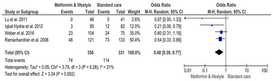 Fewer occurrences were identified for patients who received metformin plus lifestyle interventions versus standard care. Particularly, 74 (20.8%) out of 356 participants in mixed interventions developed T2DM versus 114 (34.4%) out of 331 patients in the standard care arm (Supplemental Table S2) (Figure 3). In total, 188 (27.4%) patients were diagnosed with diabetes out of 687 participants (Supplemental Table S2) (Figure 3). The result of the MA was statistically significant (OR 0.48, 95%CI 0.30, 0.77; p-value 0.002) (Figure 3). Heterogeneity across studies was non-significant (Q 3.79, p-value 0.28) (Figure 3). However, the RE model applied in the MA found the upper limit of I2 and CI to be more than 75%, indicating very high variability (I2 21%, 95%CI 0, 90%) (Figure 3).