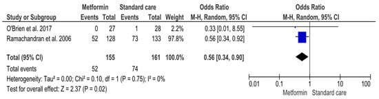 Two RCTs were included in the analysis comparing metformin versus standard care (Supplemental Table S2) (Figure 4). A total of 155 participants received metformin and 161 received standard care (Supplemental Table S2) (Figure 4). Exploring the comparative effect of metformin versus standard care, fewer diabetes cases were detected in the metformin group compared to the standard care group [52 (33.5%)/74 (46%), respectively]. In total, 126 (39.9%) participants were diagnosed with T2DM (Supplemental Table S2) (Figure 4). The result of the MA was significant (OR 0.56, 95%CI 0.34, 0.90; p-value 0.02) (Figure 4). Despite non-significant heterogeneity (Q 0,10, p-value 0.75; I2 0), variability across studies cannot be excluded due to the low number of studies and inapplicable 95%CI of I2 (Figure 4). Therefore, the data were combined with the RE model (Figure 4).