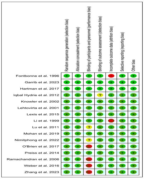 Risk of bias of eligible trials [23,24,25,34,35,36,37,38,39,40,41,42,43,44,45,46].; green color, low risk; red color, high risk; yellow color, unclear risk.