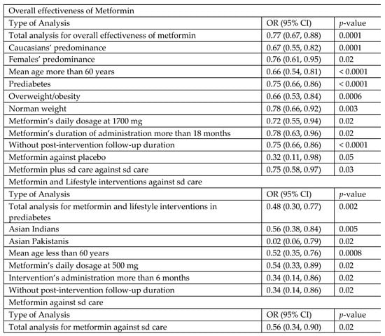 In our MA, the results support the beneficial effect of metformin in preventing T2DM among high-risk adults. Interestingly, the beneficial effects concern patients with prediabetes, obese and normal-weight patients, Caucasians, women, and patients over 60 years old. Moreover, it was demonstrated that metformin is effective at a daily dosage of 1700 mg, and after 18 months of administration, while the protective effect weakens after cessation of metformin. Metformin, irrespective of its addition to standard care, is more effective than placebo or standard care alone. Finally, our MA found that metformin and lifestyle interventions are more effective compared to standard care in preventing T2DM in patients with prediabetes. This action is more significant in men and patients younger than 60 years. Interestingly, when combined with lifestyle interventions, metformin’s effective dose is lower than when used alone to prevent T2DM. During the post-intervention period, the benefit weakens. Heterogeneity cannot be excluded in analyses. The quality of evidence is moderate for metformin’s overall effectiveness and for metformin combined with lifestyle interventions, and low for metformin against standard care. Figure 9 summarizes metformin’s overall effectiveness and the effectiveness of metformin combined with lifestyle interventions in preventing T2DM.