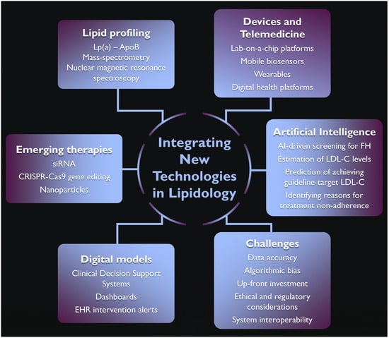 A narrative literature review was conducted to explore the most recent and relevant advances in technologies applied to lipidology. The review included original research articles, clinical trials, meta-analyses, and systematic reviews published until May 2025. A structured search was performed using PubMed/MEDLINE, Embase Scopus, SciELO and Web of Science databases with combinations of the following keywords: “cholesterol”, “low-density lipoprotein”, “high-density lipoprotein”, “lipoprotein a”, “lipidomics”, “lipoproteins”, “lipid biomarkers”, “wearable devices”, “biosensors”, “telemedicine”, “RNA therapies”, “PCSK9 inhibitors”, “CRISPR-Cas9”, “nanotechnology”, “artificial intelligence”, “deep learning”, “neural network”, and “machine learning”. Preprints were considered only if they presented significant or pioneering findings.