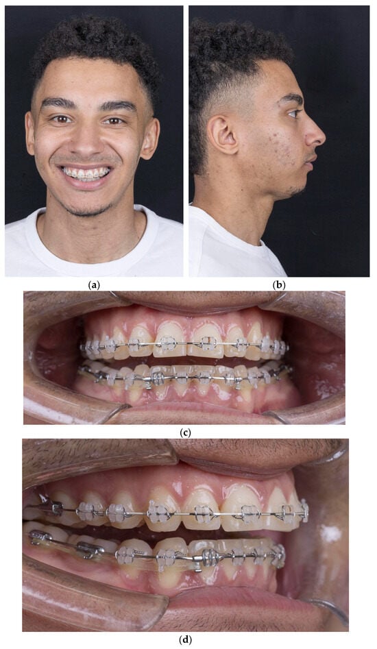 (a) Frontal view with smile; (b) lateral view showing mandibular retrusion; (c) intraoral frontal view with open bite; (d) intraoral lateral view.