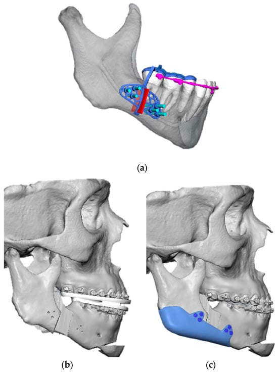 (a) VSP of the right mandibular cutting guide; (b) VSP of the mandibular reposition; (c) VSP of Implate insetting.