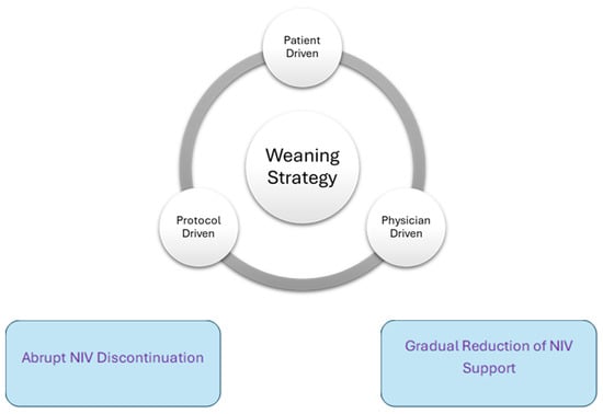 Abrupt discontinuation is the most used method, particularly in pediatric settings, where NIV is entirely discontinued once the patient meets the weaning criteria [,]. Although potentially less tolerable than gradual weaning, there are studies that conclude no difference in outcomes when compared to gradual weaning. A 2013 pilot study randomized patients with acute COPD exacerbation with acute hypercapnic respiratory failure to two study groups, comparing a stepwise versus immediate withdrawal of NIV, with a primary endpoint of NIV-withdrawal success rate. They found that these had no statistically significant difference in the success rate of NIV withdrawal [74.3% and 56% in the stepwise and immediate withdrawal groups, respectively (p = 0.139). However, the study was grossly underpowered to detect differences []. Sellares et al. [] compared abrupt discontinuation of NIV to a fixed three-night nocturnal NIV group among patients admitted to the intermediate respiratory care units (IRCU) with a COPD exacerbation who had recovered from the acute episode. Key exclusion criteria involved previous use of domiciliary NIV. They found that patients who received nocturnal NIV for three nights after the initial recovery from an episode of acute hypercapnic respiratory failure had a significantly longer IRCU length of stay (4 (2–6) versus 5 (4–7) days, p = 0.036 p < 0.001), with no statistically significant difference in the rate of complications including relapse of acute hypercapnic respiratory failure, reintubation rate, long-term ventilator dependence, hospital stay, and 6-month hospital readmission or survival [].