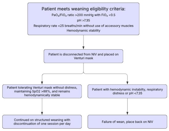 During weaning, patients must be closely monitored for signs of respiratory distress or worsening gas exchange—key indicators of their response to non-invasive ventilation (NIV). Predictors of failure include a PaO2/FiO2 ratio ≤ 200 mmHg, respiratory rate ≥ 30 breaths/min, and tidal volume > 9 mL/kg of predicted body weight [,]. The PaO2/FiO2 ratio is the most widely used measure of hypoxemia. The ratio between 150 and 200 mmHg at baseline or within the first hour of NIV is strongly associated with failure, according to multivariate analyses. This highlights the importance of timing: when NIV failure occurs, it affects both its interpretation and management.