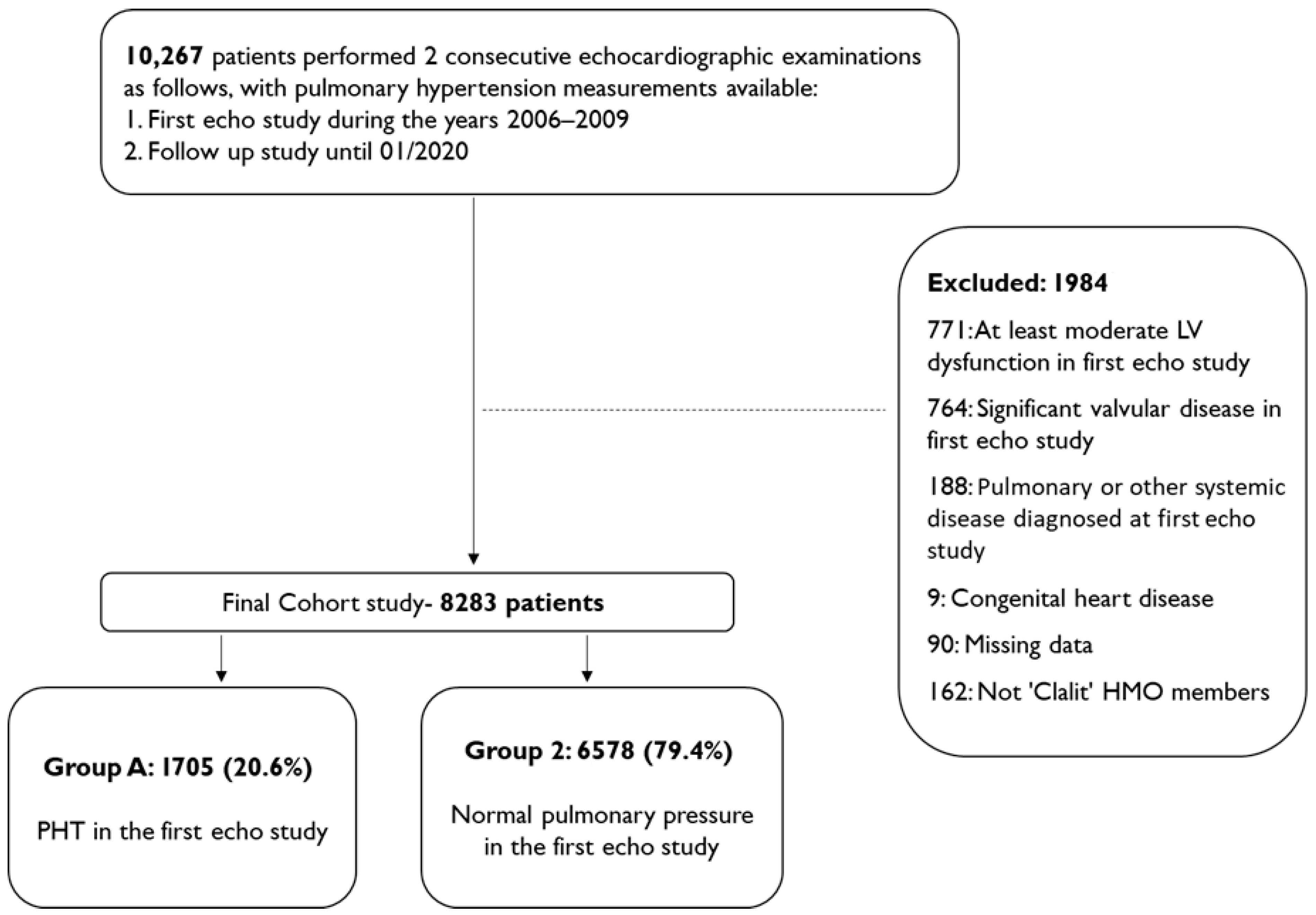 - Huston, J.H.; Maron, B.A.; French, J.; Huang, S.; Thayer, T.; Farber-Eger, E.H.; Wells, Q.S.; Choudhary, G.; Hemnes, A.R.; Brittain, E.L. Association of Mild Echocardiographic Pulmonary Hypertension With Mortality and Right Ventricular Function. JAMA Cardiol. 2019, 4, 1112–1121. [Google Scholar] [CrossRef] [PubMed]