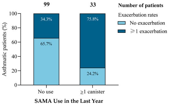 Among the 132 patients analyzed, those prescribed at least one SAMA canister in the previous year (n = 33) experienced significantly more exacerbations than non-users (75.8% vs. 34.3%; χ2 = 17.173, p < 0.001) (Figure 1). This pattern was consistent across multiple statistical methods.