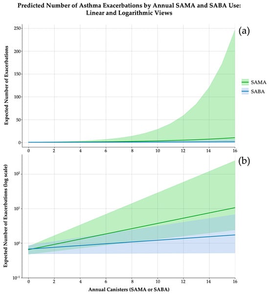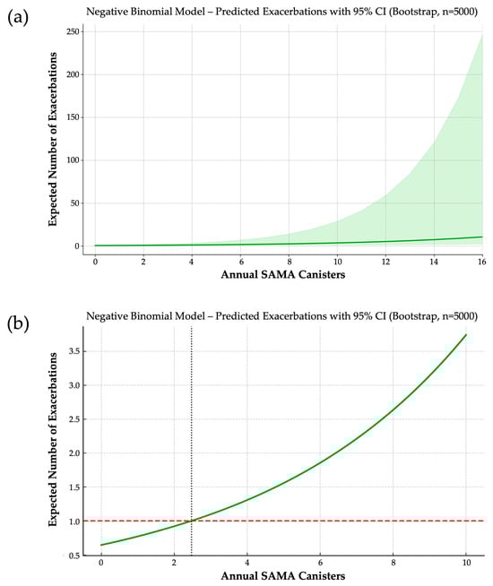 (a) Dose–response relationship between annual SAMA use and predicted exacerbation frequency. Based on a negative binomial model with 5000 bootstrap iterations, each additional SAMA canister per year is associated with a 19.2% increase in expected exacerbations. The solid line represents predicted values; the shaded area indicates the 95% confidence interval. (b) Predicted annual exacerbation rate by SAMA exposure and identification of a clinical threshold. A negative binomial model estimates exacerbation risk across increasing annual SAMA use. The horizontal dashed line marks one exacerbation per year—a widely accepted threshold of poor asthma control. The vertical dotted line indicates the inflection point (~2.5 canisters/year) beyond which predicted exacerbations exceed one, suggesting a clinically actionable cutoff.