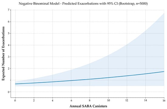 Predicted exacerbation frequency by annual SABA use. Negative binomial regression with 5000 bootstrap iterations estimates the expected number of exacerbations across increasing SABA canister use. The solid line represents model-predicted values; the shaded area indicates the 95% confidence interval. Although modest in magnitude, the model reveals a consistent upward trend in exacerbation risk with higher SABA exposure.