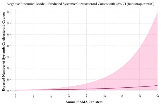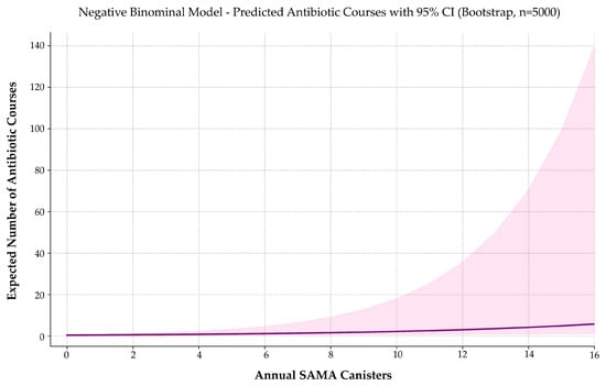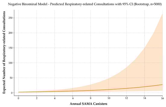 Predicted number of respiratory-related antibiotic prescriptions by annual SAMA use. A negative binomial model estimates expected annual antibiotic use as a function of SAMA canister dispensing. The solid curve represents predicted values; the shaded band indicates the 95% confidence interval. Antibiotic prescriptions increase progressively with SAMA exposure, suggesting a potential association with higher respiratory morbidity or symptom burden in asthma management.