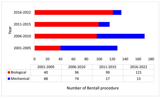 Distribution of the Bentall procedure with a biological or a mechanical valved conduit during the study period.