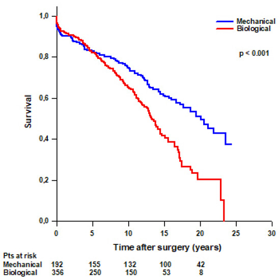 First described in 1968 by Bentall and De Bono [1] and then modified by Kouchoukos [2], the Bentall procedure allows a radical replacement of the aortic valve, the aortic root, and the ascending aorta with a valved conduit and thus represents the gold standard therapy in patients with ascending aorta or aortic root aneurysm combined with aortic valve disease precluding a valve-sparing procedure. The valved conduit may have a biological or mechanical prosthetic valve, and the choice between the two different types of prosthesis is currently based on the patient’s life expectancy, lifestyle and environmental factors, bleeding and thromboembolic risks related to anticoagulation, potential for surgical or transcatheter reintervention, and informed patient preference according to international guidelines [3]. The main concerns are related to the risk of thromboembolic and/or bleeding events and poorer quality of life due to lifelong anticoagulation for mechanical valves and the risk of structural valve dysfunction (SVD) requiring reintervention for biological valves. Previous studies of aortic valve replacement have had divergent results. A study involving 1001 matched pairs of patients 50 to 69 years of age who underwent isolated aortic valve replacement showed no significant difference in 15-year survival or stroke between biological and mechanical prosthesis [4]. Patients in the bioprosthetic valve group had a greater likelihood of reoperation but a lower likelihood of major bleeding [4]. Another study involving 287 matched pairs of patients aged 50 to 59 years showed that mechanical prostheses were associated with substantially lower mortality than biologic prostheses [5]. The risk of stroke was similar between the two groups; however, patients with bioprostheses had a higher risk of aortic valve reoperation and a lower risk of major bleeding [5]. Few studies compared the outcomes of biological versus mechanical valved conduits in patients undergoing the Bentall procedure [6,7,8,9,10,11] with controversial results; thus, the aim of this study was to compare early and late outcomes in patients undergoing a Bentall procedure with either a biological or a mechanical valved conduit using a propensity-score matching (PSM) analysis. The primary endpoint of this study was to evaluate the mortality in patients undergoing modified Bentall procedure; the secondary endpoints included cardiac reoperations for all causes.