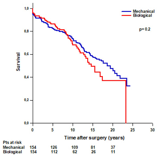 After PS-matching, we found that 55 (36%) patients with a biological Bentall and 78 (51%) patients with a mechanical Bentall died during the follow-up (Table 4). No difference was found in mean survival time between patients with a mechanical Bentall and patients with a biological Bentall (16 ± 0.7 vs. 14.8 ± 0.8 years, respectively, p = 0.2) (Figure 4). Survival rates were 94.8% at 30 days, 91.5% at 1 year, 82.4% at 5 years, 73.6% at 10 years, 58% at 15 years, and 47.3% at 20 years in patients with a mechanical Bentall and 96.1% at 30 days, 93.5% at 1 year, 86.5% at 5 years, 69.4% at 10 years, 49.3% at 15 years, and 37% at 20 years in patients with a biological Bentall.