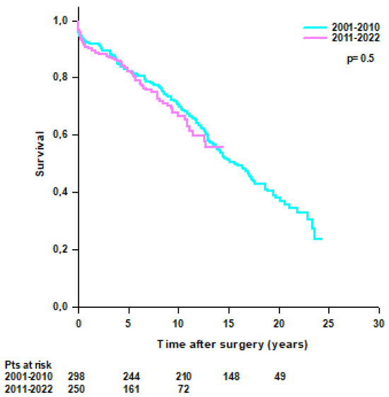 No difference was found in survival rates between patients operated on from 2001 to 2010 and patients operated on from 2011 to 2022 (95.3% at 30 days, 92.3% at 1 year, 82.1% at 5 years, and 70.6% at 10 years vs. 96.4% at 30 days, 90.8% at 1 year, 82.9% at 5 years, and 66.7% at 10 years, respectively; p = 0.5) (Figure 5).