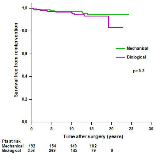 Patients’ survival free from reoperation after modified Bentall procedure with a mechanical or a biological valved conduit.