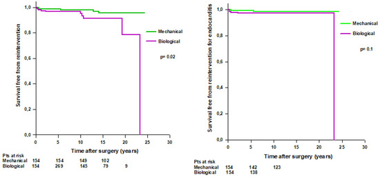 After PS-matching, we found that 10 (6%) patients with a biological Bentall and 5 (3%) patients with a mechanical Bentall underwent reintervention during the follow-up (Table 6). Patients with a mechanical Bentall had a significantly higher mean survival time free from reintervention compared to patients with a biological Bentall (23.6 ± 0.4 vs. 21.4 ± 0.7 years, respectively, p = 0.02) (Figure 7 left). Survival rates free from reintervention were 98.6% at 5 years, 97.9% at 10 years, and 95.5% at 15 years in patients with mechanical Bentall and 96.5% at 5 years, 95% at 10 years, 91.4% at 15 years, and 78.3% at 20 years in patients with biological Bentall. No difference was found in survival free from reintervention for infective endocarditis between the two groups (Figure 7, right).