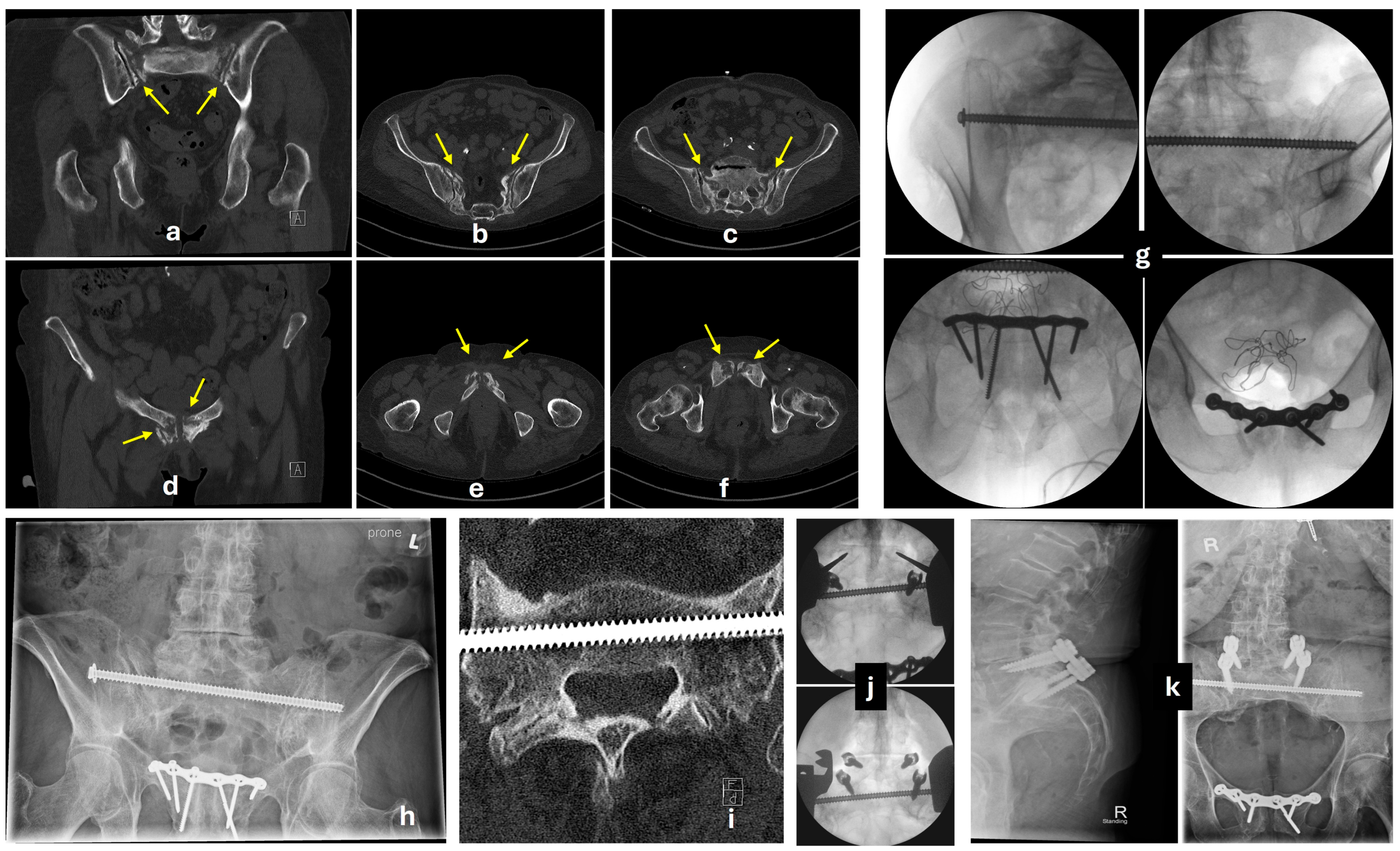 - Heydemann, J.; Hartline, B.; Gibson, M.E.; Ambrose, C.G.; Munz, J.W.; Galpin, M.; Achor, T.S.; Gary, J.L. Do Transsacral-transiliac Screws Across Uninjured Sacroiliac Joints Affect Pain and Functional Outcomes in Trauma Patients? Clin. Orthop. Relat. Res. 2016, 474, 1417–1421. [Google Scholar] [CrossRef] [PubMed]